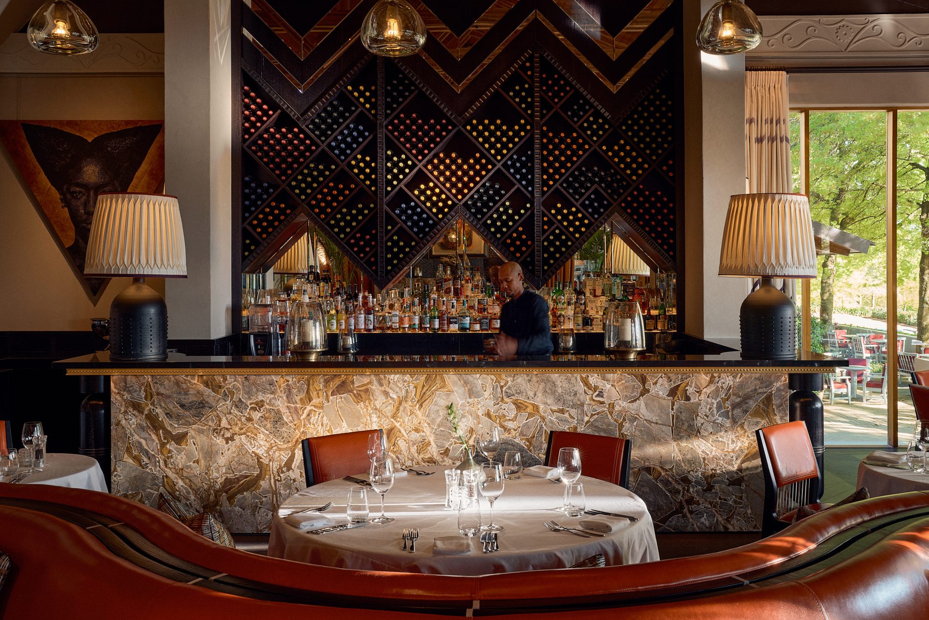 Interiors blend natural materials and vibrant seating in an artful nod to the Estate’s locale. The centrepiece – a pair of serpentine banquettes upholstered in orange leather – curve gracefully through the space. In contrast, dark oak floors, vellum-toned rendered walls and timber wainscot panelling provide a perfect setting for Laurence Graff’s renowned, contemporary African art collection.