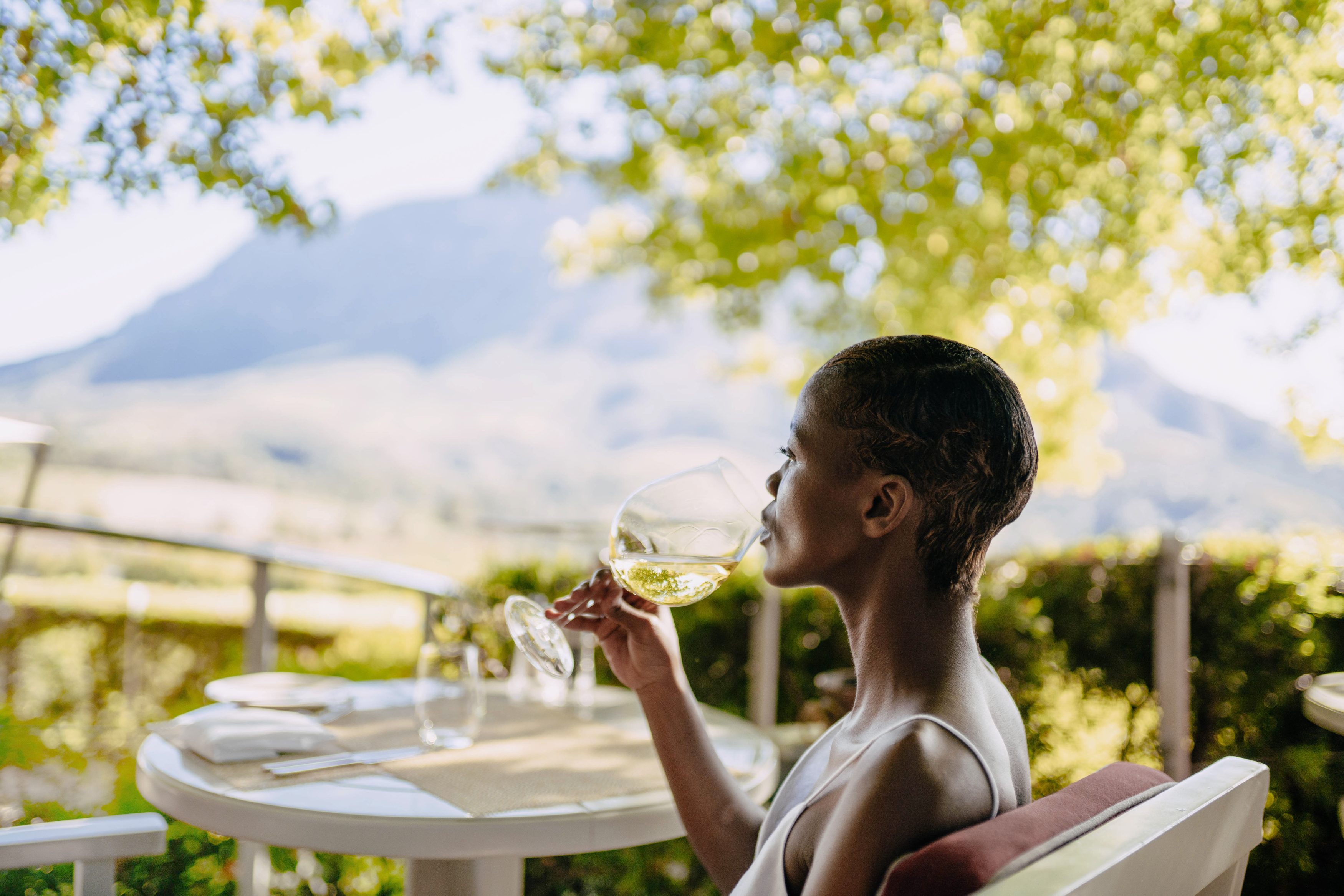 Shaded from the radiant South African sunshine by the boughs of majestic, ancient oak trees, the sweeping terrace at Delaire Graff Restaurant embraces breathtaking, panoramic views of vineyards and olive groves, from Simonsberg Peak across the Banghoek Valley.