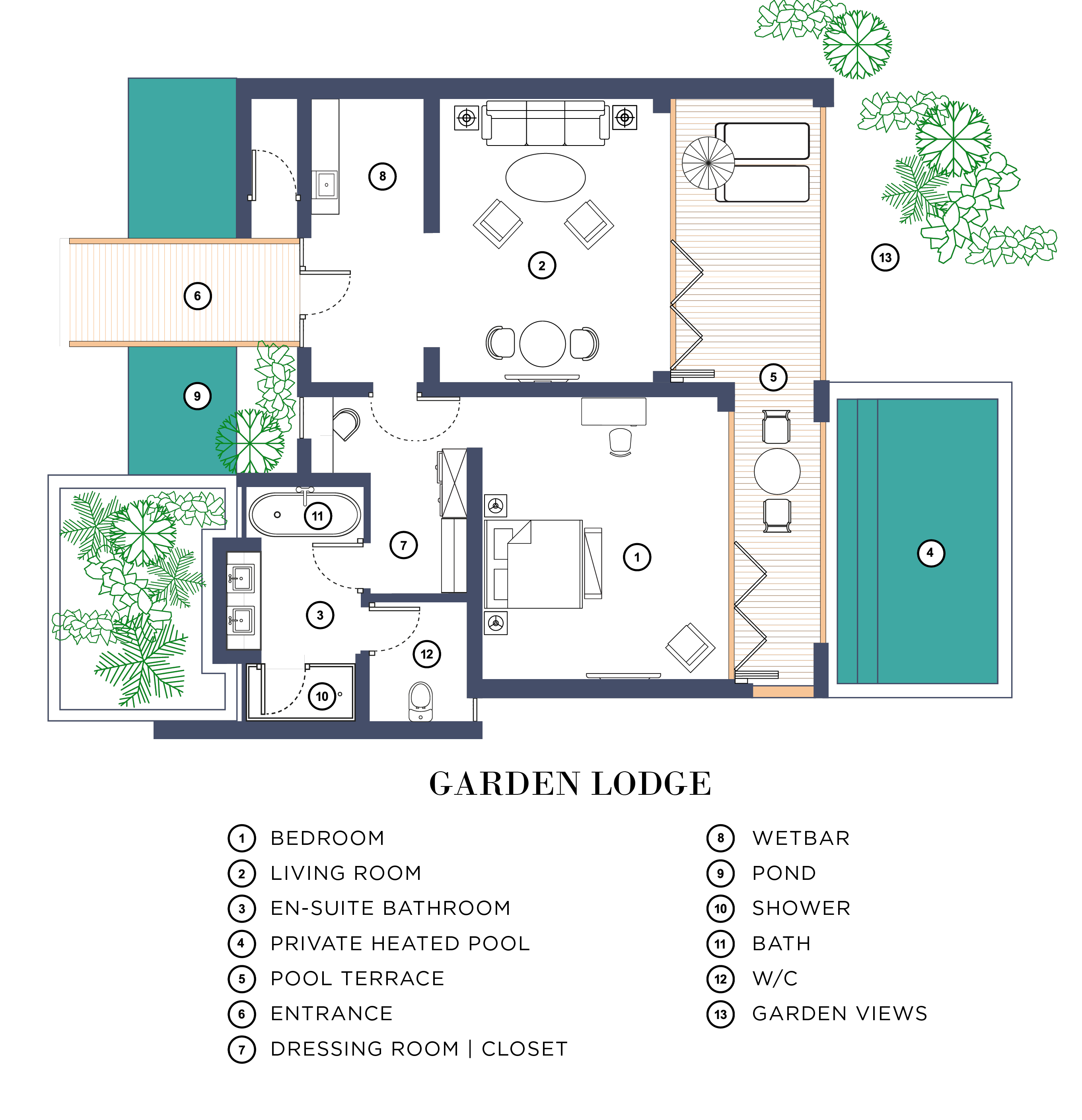 Each Garden Lodge is a tranquil retreat offering seamless indoor/outdoor living. Overlooking a garden lined with ancient oak trees, the en-suite bedroom and living room both open out onto a terrace with a heated pool.