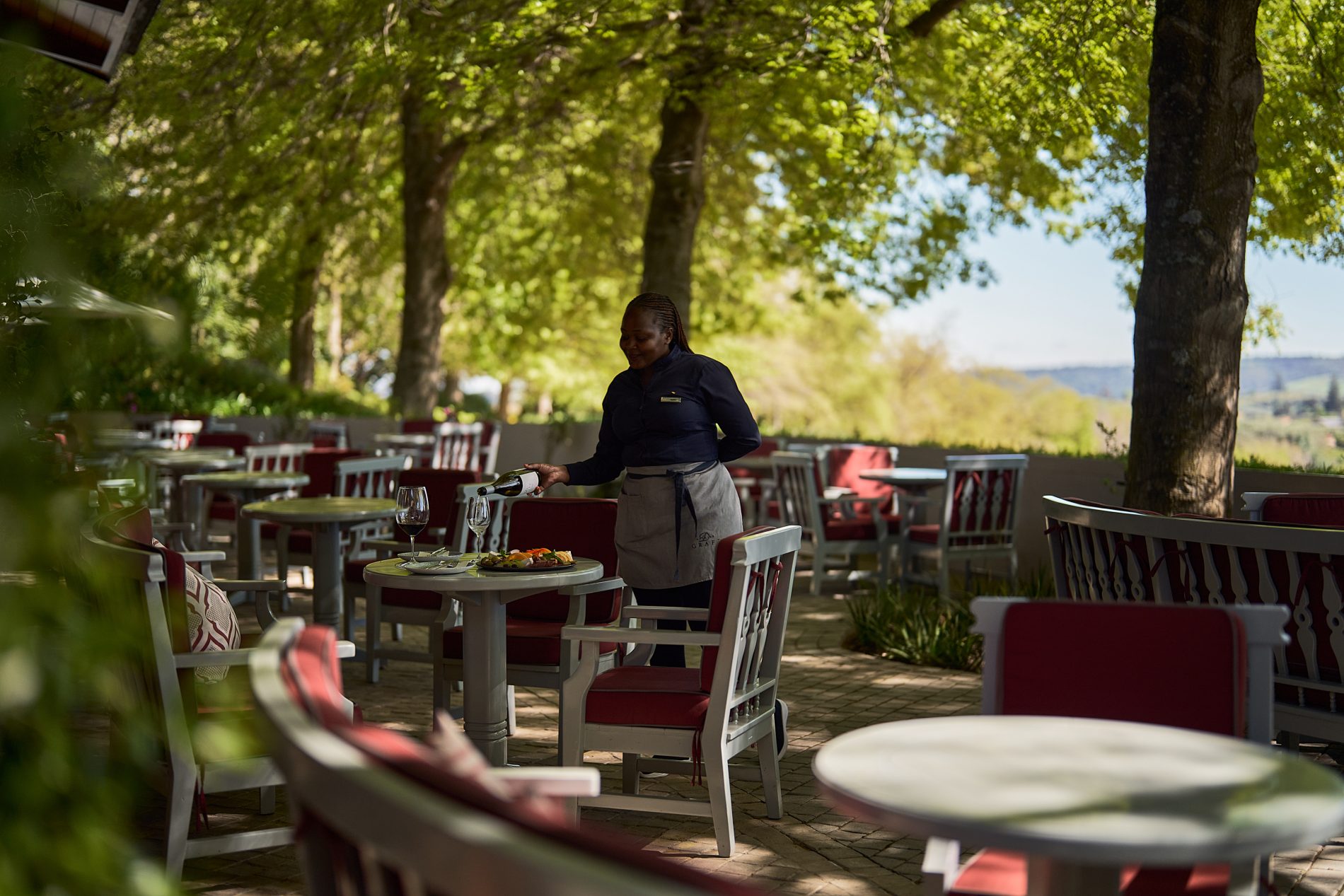 Savour a glass of Delaire Graff wine all-year round at the art-filled Wine Lounge – on the spacious terrace in the summer, encircled by dramatic mountain views, or inside accompanied by a crackling log fire come winter.